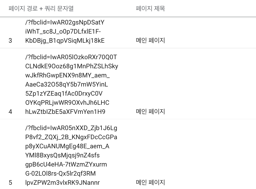 여기서 /?fbclid=로 시작하는 방문페이지는 익숙한 분도 계시겠지만 파라미터가 물려 있는 것이라고 이해하시면 되요. 따라서 광고에 의해서 utm을 물고 들어왔다고 보시면 됩니다.