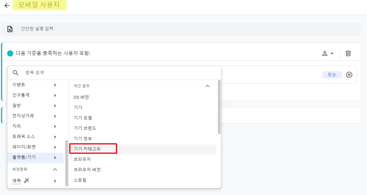 step 4. 세그먼트명을 입력해주고, 기기카테고리의 조건을 주기 위해 기기카테고리를 선택해줍니다.