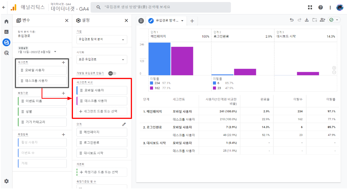 => 위 샘플 데이터를 비교해본 결과, 데스크톱 사용자가 3단계까지의 전환율이 더 높은 것을 확인하실 수 있습니다.