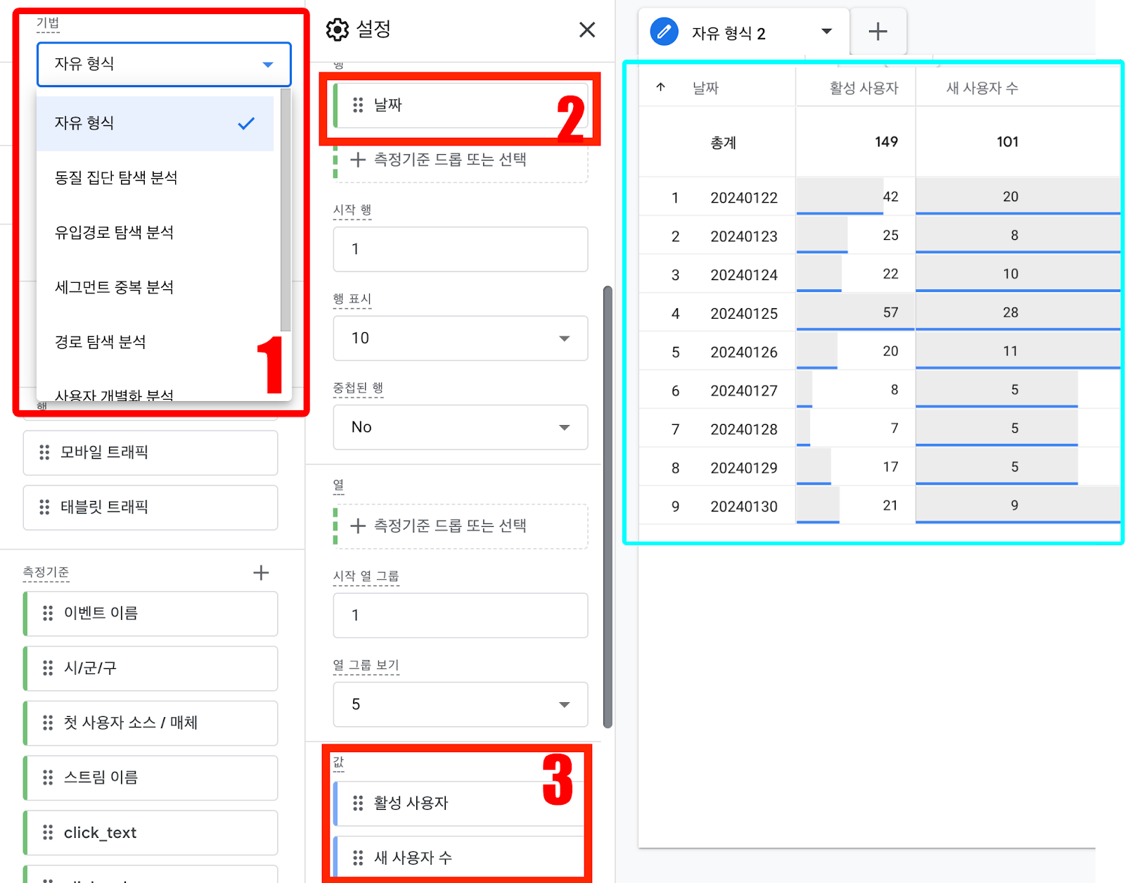다음은 A라는 사이트에서 24년 1월 22일부터 1월 28일까지의 데이터를 자유형식 분석을 활용해 데이터를 확인한 예시예요.