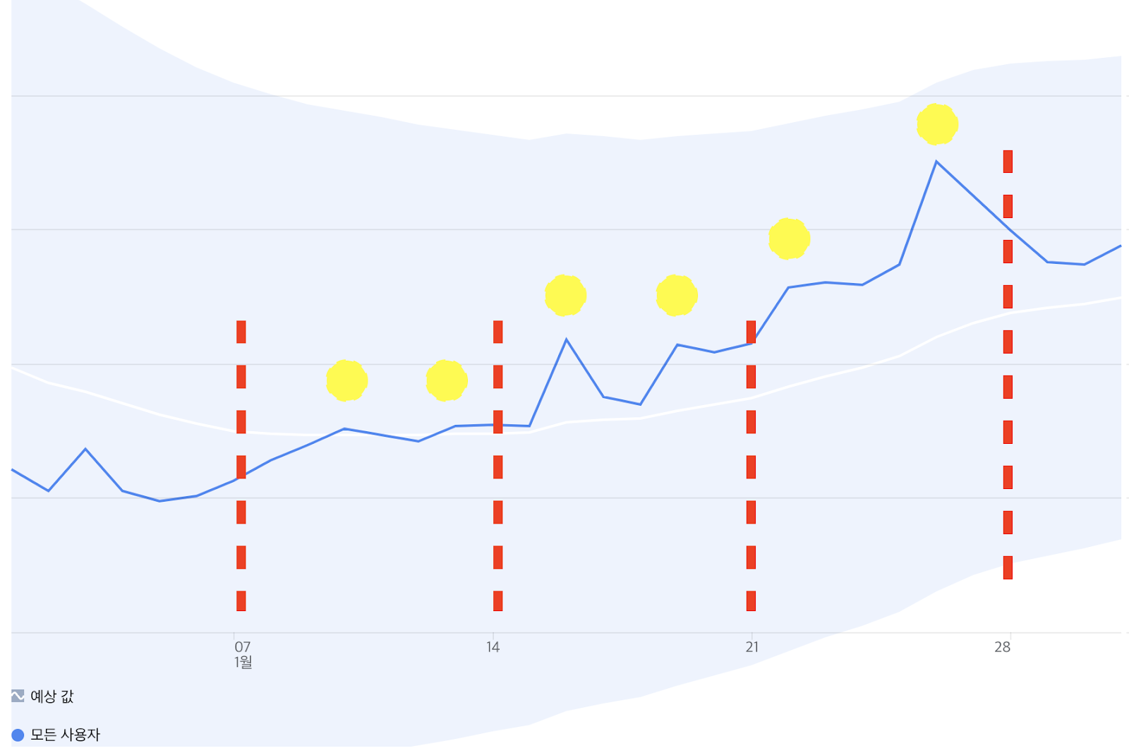 -> 패턴을 예상해서 사용자가 적게 들어오는 날짜에 할인이벤트를 걸거나 많이 들어오는 날짜에 친구초대 이벤트 등을 진행하는 등 예측 마케팅이 가능해져요.