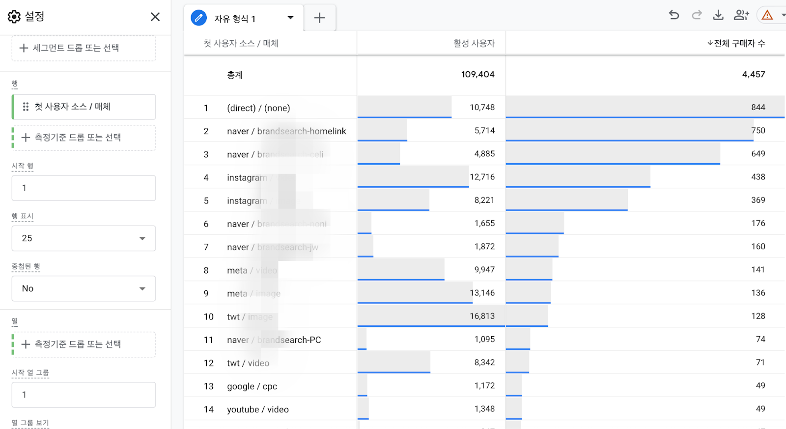 여기서 볼 수 있는 데이터는 행에 첫 사용자 소스/매체(처음 방문한 사람들이 어떤 경로로 들어왔는지), 값에 활성 사용자가 될 수 있습니다. 저는 전환도 보고 싶어서 값에 전체 구매자 수도 같이 넣어 보았어요.
