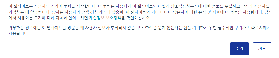 또한, 웹사이트를 방문했을 때, 쿠키 수집에 대한 안내창을 보신 적이 있으신가요? 쿠키 수집을 동의했을 경우 환경 구축과 비즈니스에 따른 쿠키수집 약관 작성 등 자세한 내용을 확인하고 쿠키 수집에 대해 수락 및 거부할 수 있는 안내창이에요. 퍼스트 파티 쿠키를 수집하기 위해 개인정보보호 위원회의 개인정보 처리 방침에 따라 작성해야 해요.