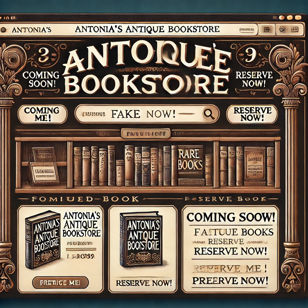 앤토니아는 실제 서점을 개점하기 전에, 웹사이트를 제작하여 ‘앤토니아의 앤티크 서점, 곧 오픈 예정!’이라는 페이지를 공개했습니다. 사이트에서는 희귀 서적의 목록과 사진을 제공하고, 방문객들에게 ‘사전 예약하기’ 또는 ‘입고 알림 신청’ 버튼을 클릭할 수 있도록 했습니다.